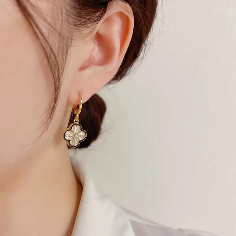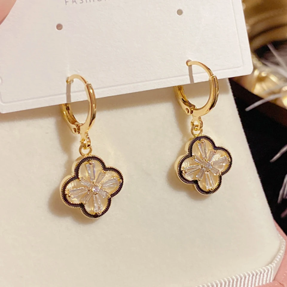 Add a touch of elegance and charm with these Four-Leaf Flower Dangle Earrings. Crafted with a delicate copper-plated finish and sparkling zircon accents, these earrings feature a graceful floral design that brings a radiant, feminine touch to any outfit. Perfect for parties, weddings, or everyday wear, their lightweight construction ensures comfort while adding a subtle sparkle to your look.